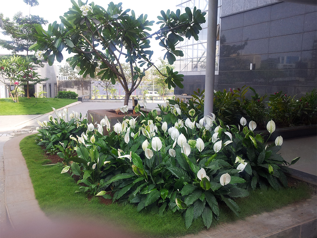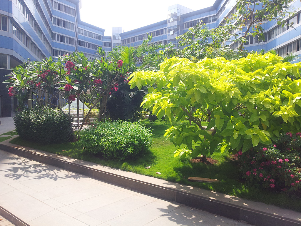 The client came to us for landscaping for a project that was built 8 years. The project posed multiple challenges. Due to the passage of time, the previous architects or structural engineers could not be contacted regarding the structural details. We started by studying the site and designing accordingly. There were no sunken areas that could be used for plantation. We also had to keep the design light so as to avoid damages to the structure. We did this by using the existing slab innovatively. The lawn was laid down in 6 to 8 inches deep sections. Stainless steel and glass are carefully used for the head office of Diamond Bourse. Pergolas, benches for seating and lighting features complete the overall landscape.