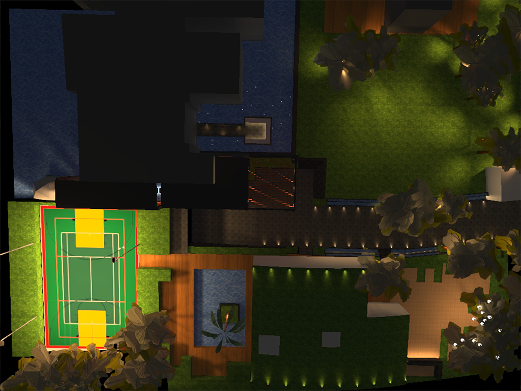 The client envisioned a landscape illumination that would compliment the rustic theme of the project as well as the inclined green roof Clubhouse/Office which was the unique feature. Keeping this in mind, we have designed the illumination for the sports area swimming pool, individual private garden area water body compound lighting. The pathway is highlighted by inground directional spots and the cascading water is highlighted by linear wall washer and up lighting tree foliage creates a majestic entrance experiences. The multipurpose court is given proper flood lighting as per sports standards. The lawn and the private garden are lit by moon lighting technique on existing trees. The inclined clubhouse green roof pitch is highlighted using LED spots. The official lounge area is uniformly lit by hanging lanterns on existing trees. The water body is lit using fibre optic and under water light.