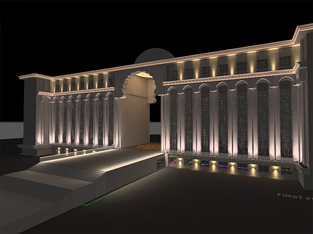 The design for this educational institute had to such that it’ll bring out the architectural features of the structure. The façade lighting is used in such a way that it accentuates the architectural features like the arches, dome, entrance, bridge and the atrium. The Majestic Avenue and tree plaza is created by a combination of light pillar, a soothing and calming water front & up lighting tree foliage.A floating bridge effect is created by LED strip / dot less light to create an elevated bridge effect