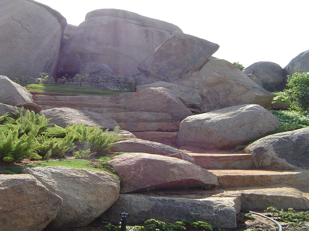 The client wished for a landscape design that would incorporate the naturally available boulders and have a minimal look. We got to work with renowned Architect Mario Botta on this project. The idea was to create such a landscape that would create a perception of the structure being set in the natural surroundings. This was done by including the natural boulders available on the site in the design. The plantation palette is restricted to green to bring out the earthy colour of the structure.