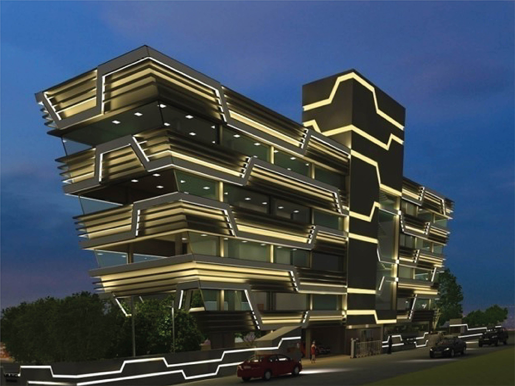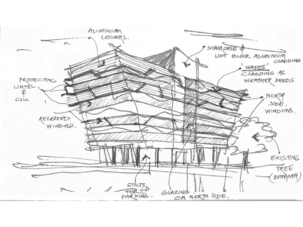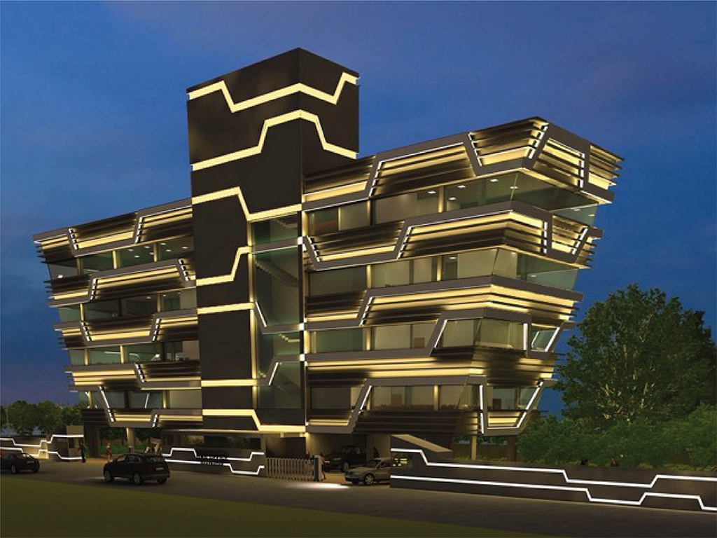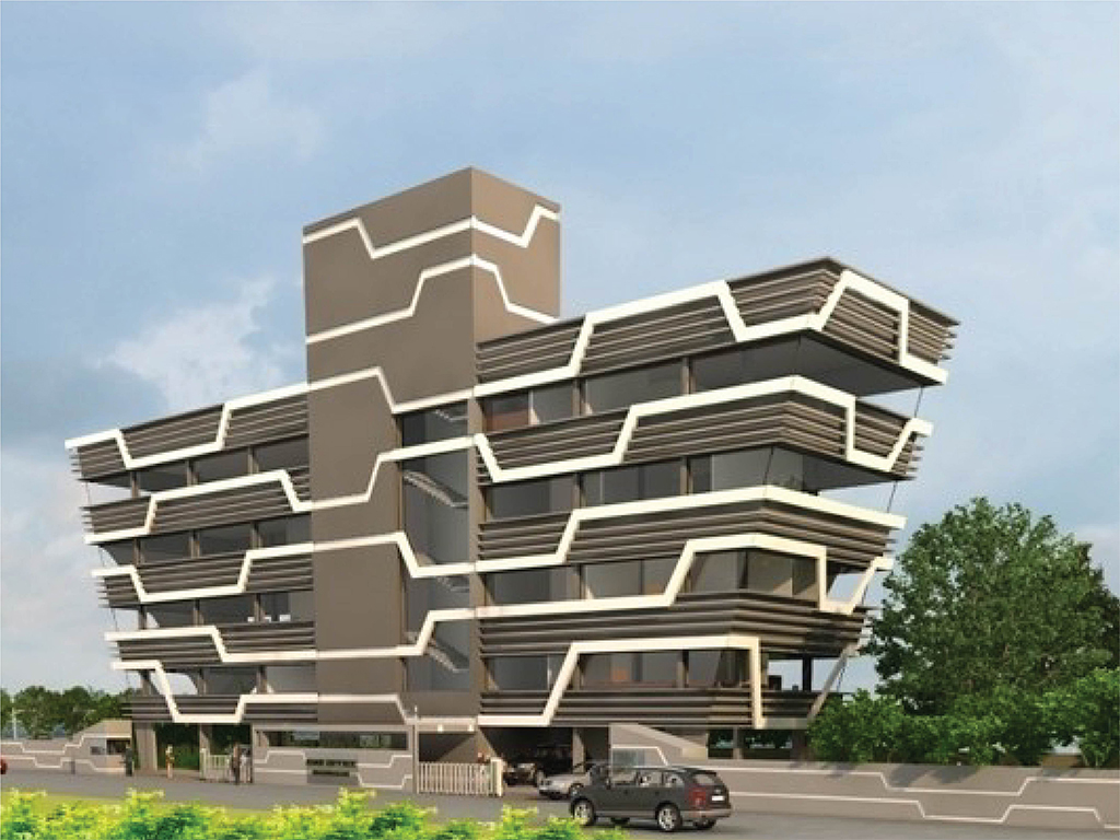 The client envisioned a structure indicative of his business in terms of presentation and size. The client’s vision for the office was to create a visual identity that resonated with the core utility of the structure. Keeping this in mind, the architecture of the office of the maritime company was inspired from a ship sailing the ocean. The material used in the construction gives the building the look of the exterior of a ship. A modern looking façade has been designed using aluminium cladding louvers which makes the design light, easy to install and have a long life. With a downward tapering design, the floor plates follow a circular pattern with the lifts and staircases strategically located in the centre. A thick and shady landscape provides covered seating areas around the construction. The paving and seating benches follow the recurring wave pattern of the structure. Safety measures and service areas have been incorporated in the structure without breaking away from the basic theme.