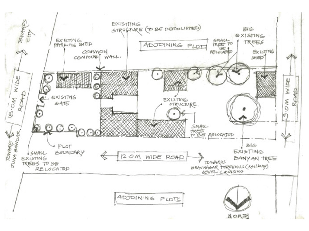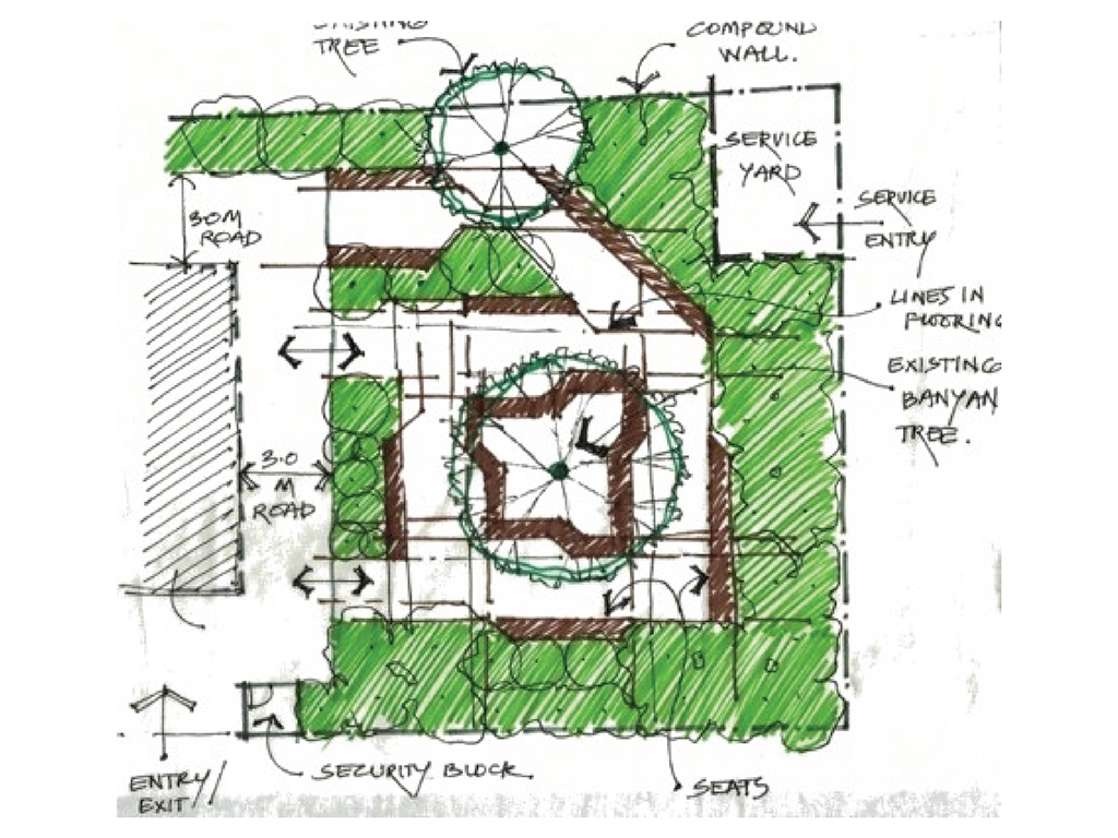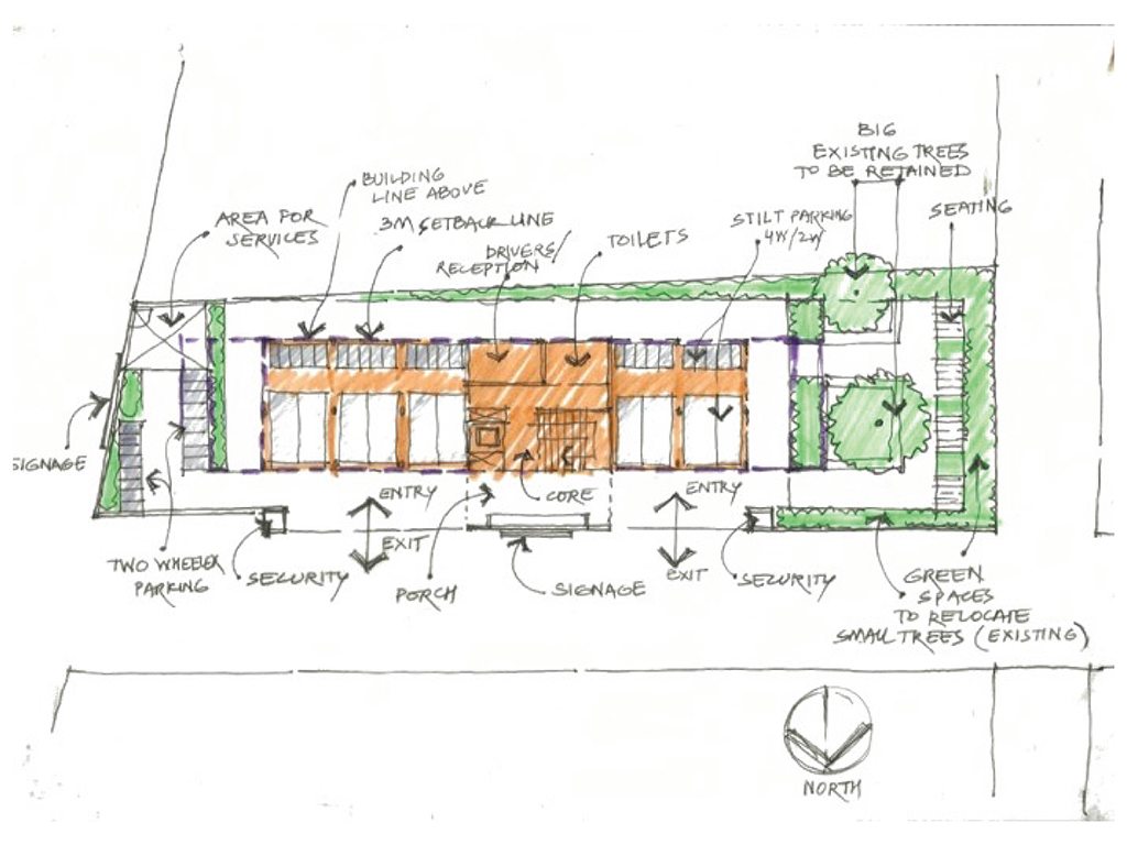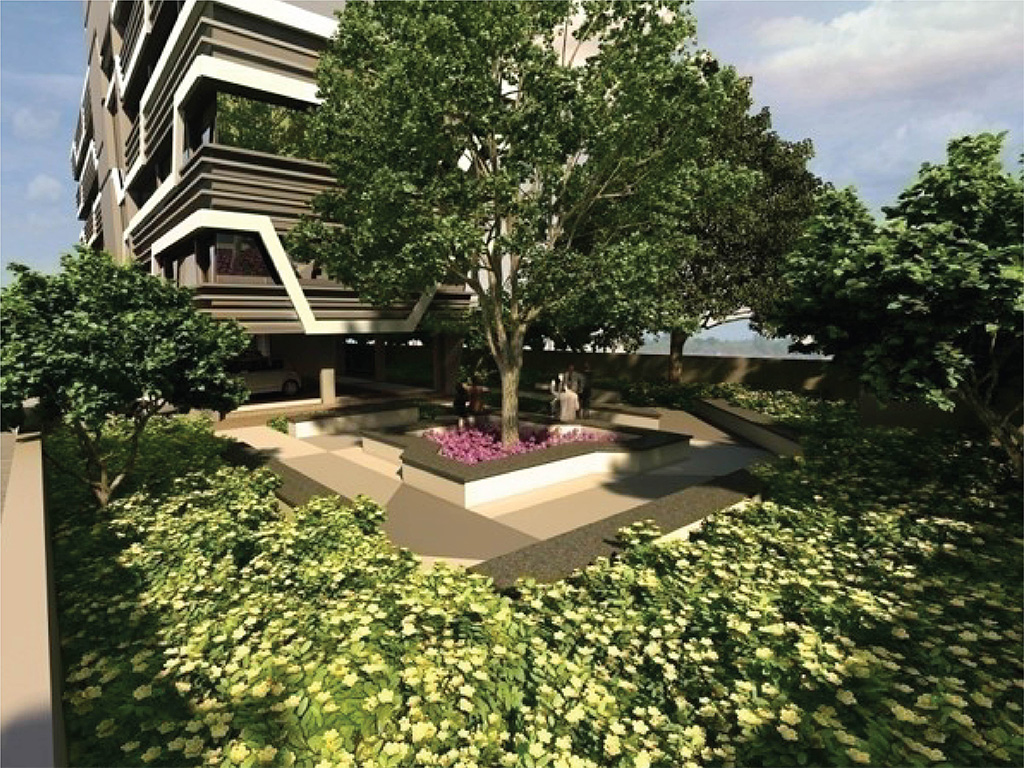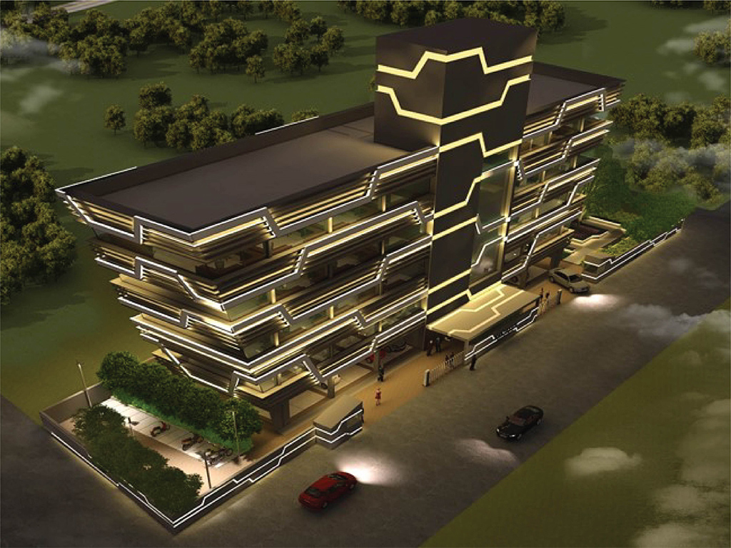 The client envisioned a structure indicative of his business in terms of presentation and size. The client’s vision for the office was to create a visual identity that resonated with the core utility of the structure. Keeping this in mind, the architecture of the office of the maritime company was inspired from a ship sailing the ocean. The material used in the construction gives the building the look of the exterior of a ship. A modern looking façade has been designed using aluminium cladding louvers which makes the design light, easy to install and have a long life. With a downward tapering design, the floor plates follow a circular pattern with the lifts and staircases strategically located in the centre. A thick and shady landscape provides covered seating areas around the construction. The paving and seating benches follow the recurring wave pattern of the structure. Safety measures and service areas have been incorporated in the structure without breaking away from the basic theme.