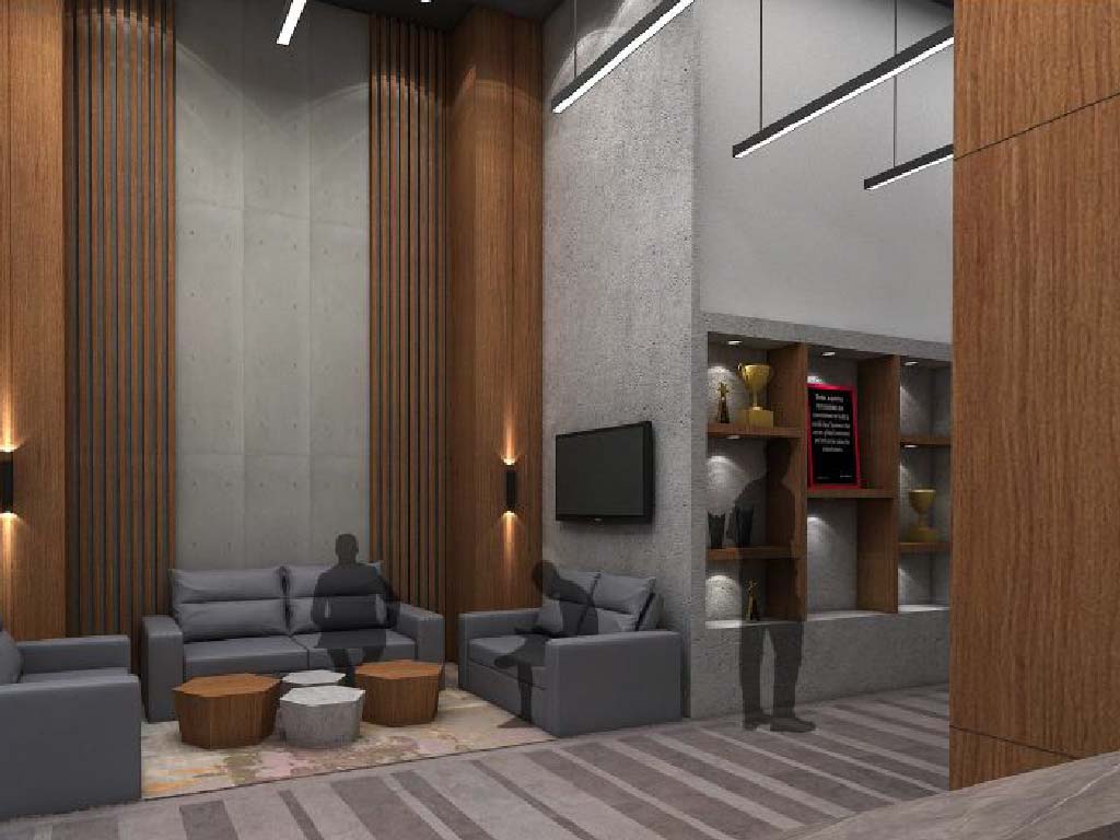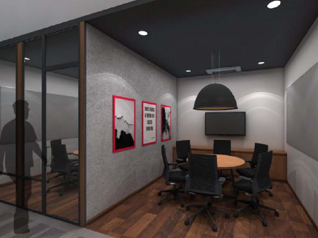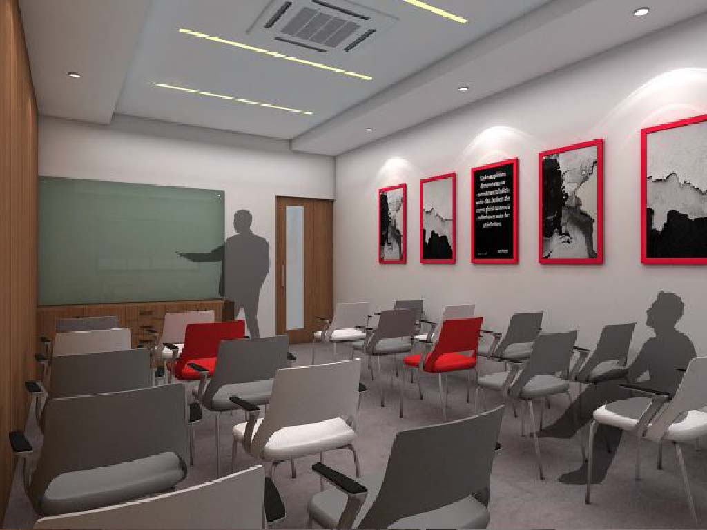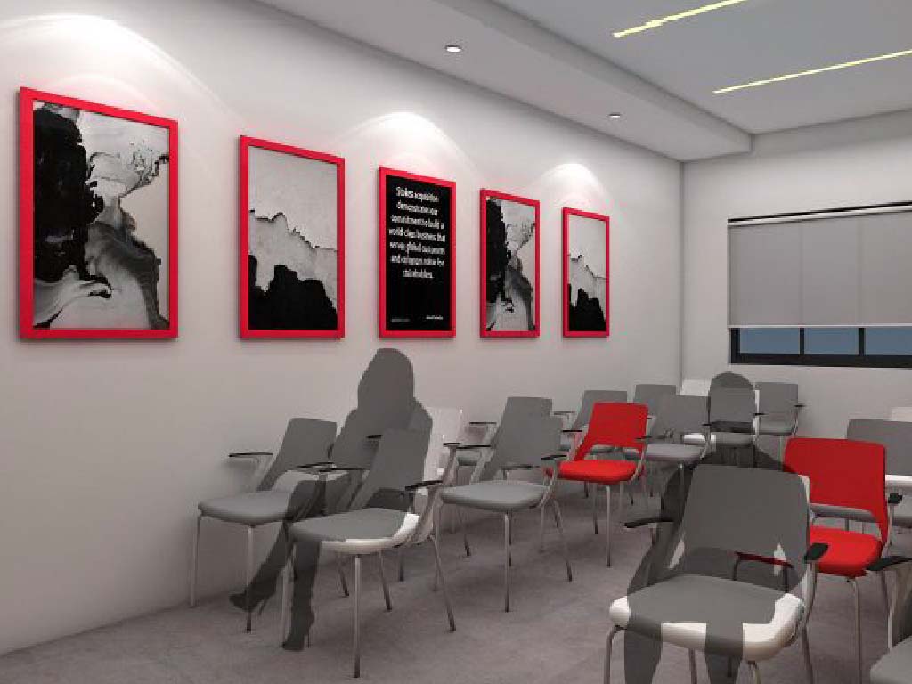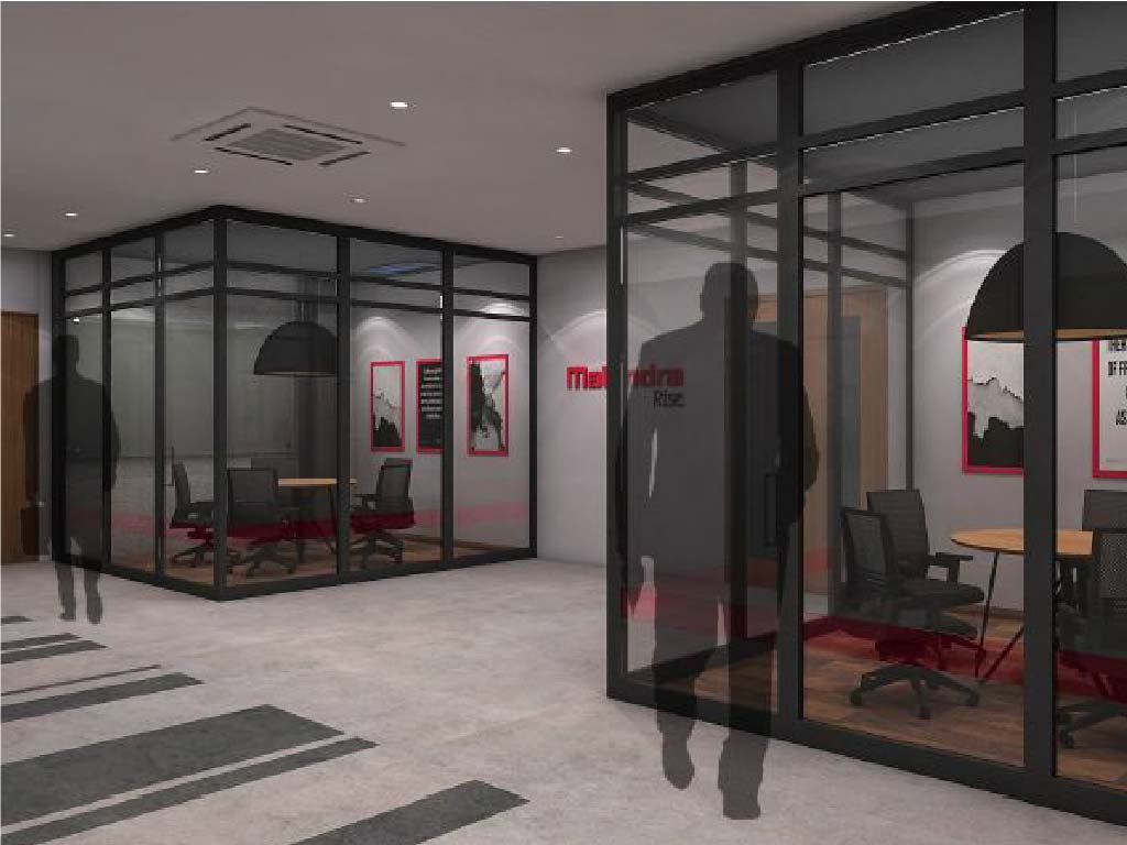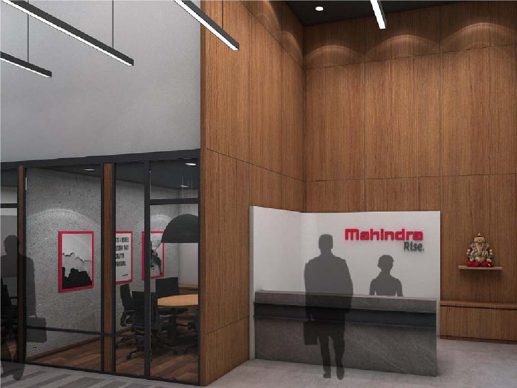 The client envisioned to create a modern and upbeat working space – A space that would encourage and motivate the employees working in it. The challenge was to make it an upbeat working space and blend in the brand identity of Mahindra and Mahindra. The design uses walnut wooden textures and has grey vitrified tiles. Grey paint is incorporated to balance out the space. A modern look is given by using linear lights without compromising on the efficiency of the space. The overall space is brought together through the use of graphics in brand colours.
