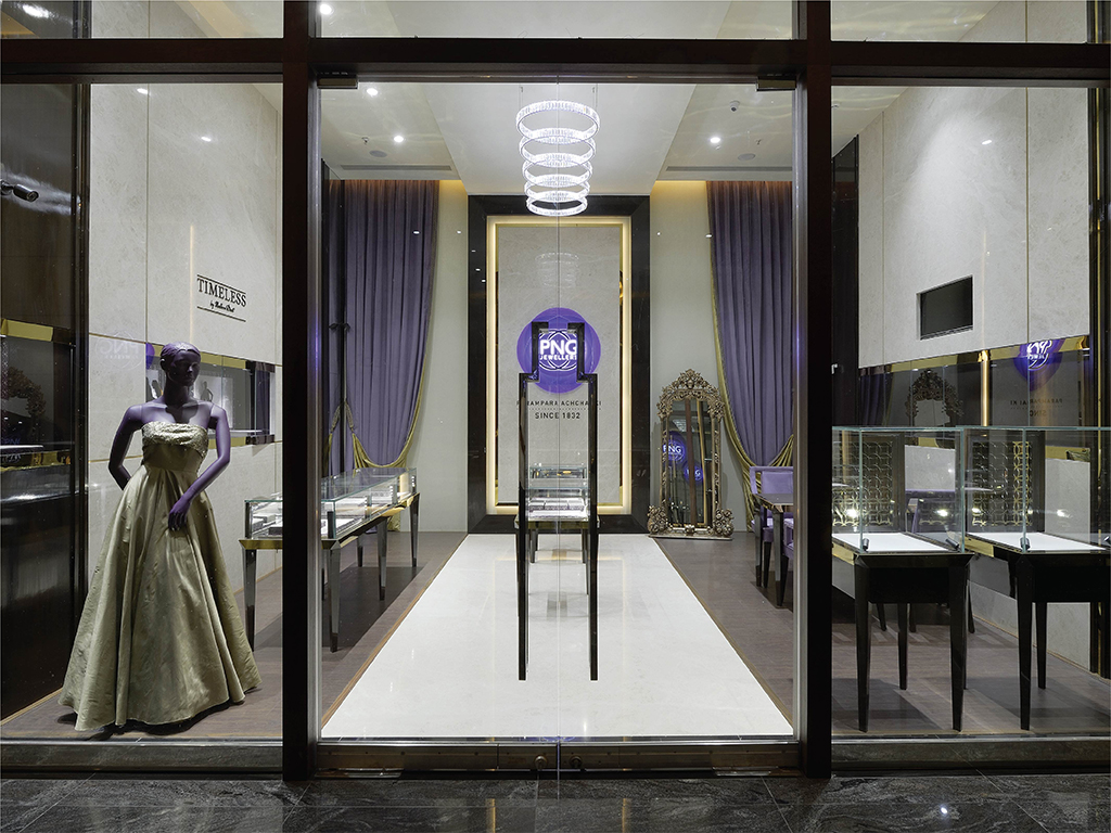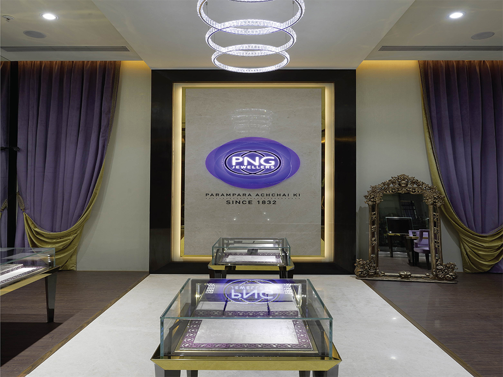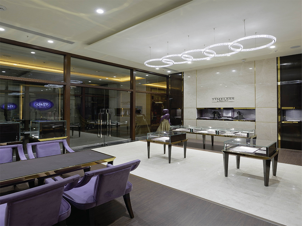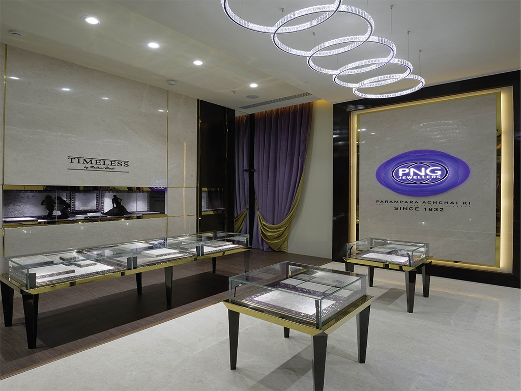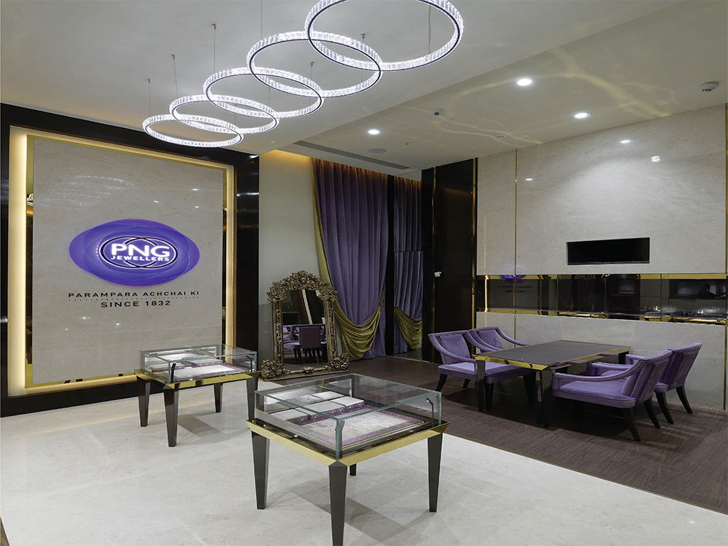 A client such as PNG expects designs as innovative and grand as the brand it is. Therefore, the boutique to display their exquisite diamond jewellery had to be equally marvelous. The idea of the design was to bring the focus on the jewellery on display and hence a minimalist approach was adopted. The materials used in the design reflected the brand identity through the colour schemes, use of lights, lightness of elements and the linear visual language. The boutique is housed inside a 5 – star hotel and therefore the layout, material used and the illuminations have been designed according to the expected clientele. A beautiful customized crystal chandelier lights up the entire space bringing out its grandeur!
