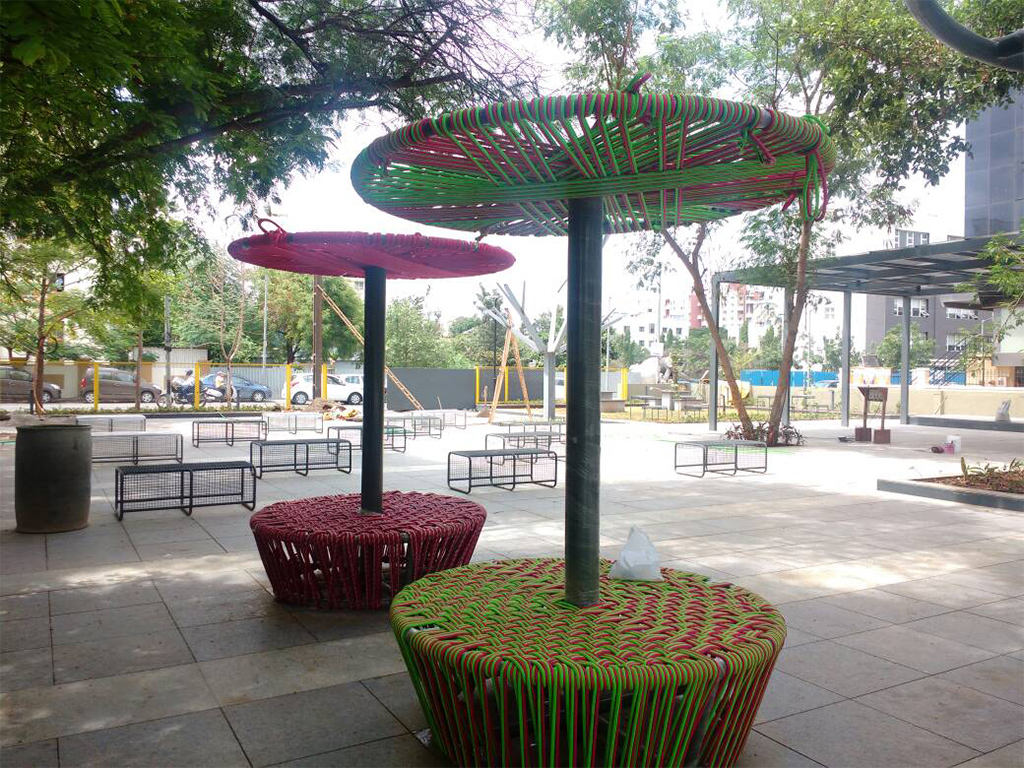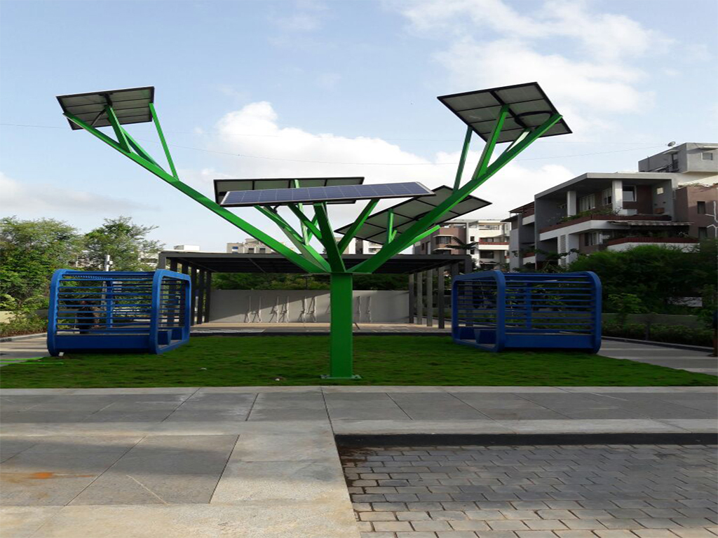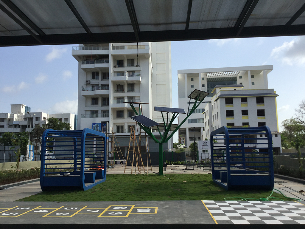 The Pune Smart City project is intended at upgrading the neighbourhood public spaces and the standard of living through a wide spread use of sustainable energy using various installations. Placemaking is one such project planned for an enhanced community living experience. The challenge was designing a versatile open space on the principles of cost efficiency, enhancing natural site conditions, high social impact, sustainability and zero power. Innovative and experimental ways had to be worked out, tired and tested before introducing it for public use. Techniques to harness the renewable sources of energy for regular use within these spaces have been worked out efficiently. Storm water harvesting to replenish the ground water table is installed to balance the natural resources. To make the space self reliant in terms of electrical use, a unique ‘Solar Tree’ and solar roof seatings are designed to maximise the conversion of solar energy into electricity for illumination and charging stations. These elements and principles are developed in great detail for the spaces to be used in three particular social scenarios. 1. E learning and skill development- Semi open and open spaces powered by renewable energy systems to promote spaces for workshops and group activities. The target user group is the youth, attracting the tech savvy crowd as a more active way of spacial use. 2. Leisure and meditation- Spaces used for fitness and mental health purpose so as to actively involve in the natural elements around. Workout sessions and health related group activities carried out for a general wellness awareness. 3. Art and ecology- Promotion of spaces that help interact with nature on a personal level and make use of natural surroundings to push art appreciation. This space is ideated for artists and art admirers to socialise within the realms of nature and sustainability while creating a strong social dialogue.