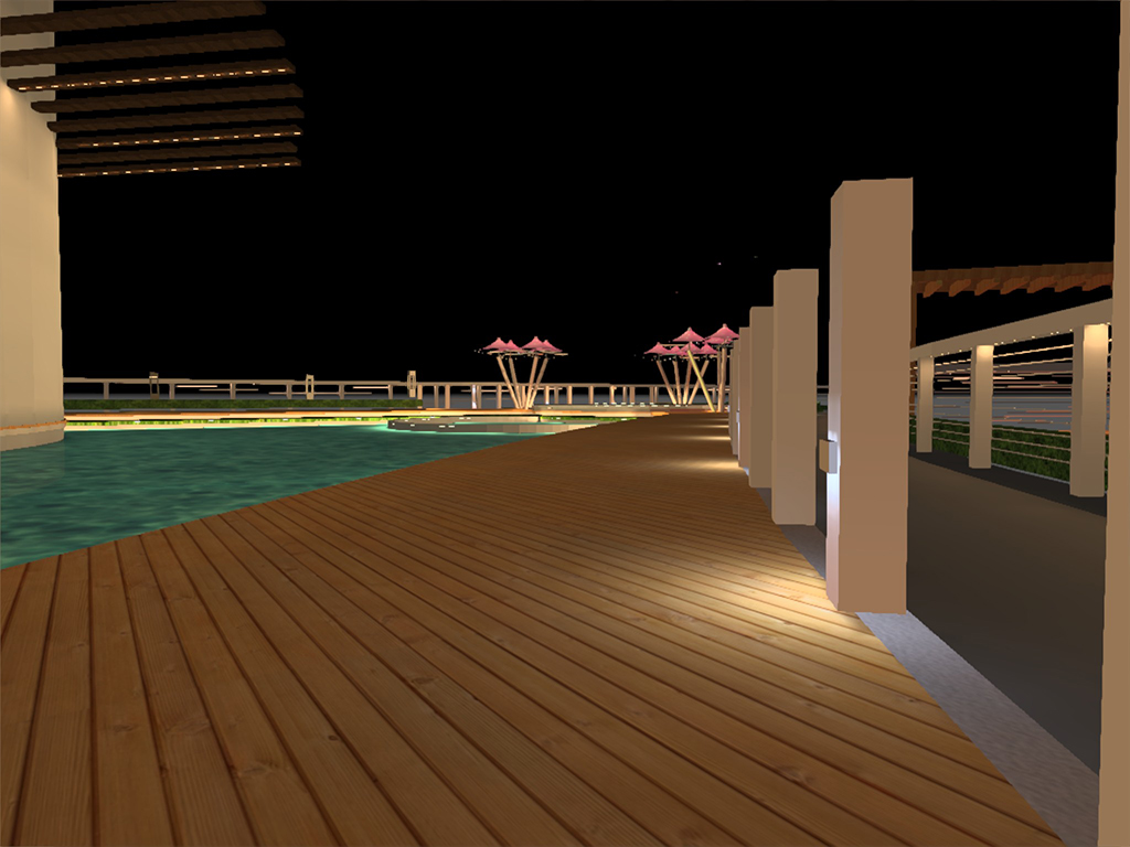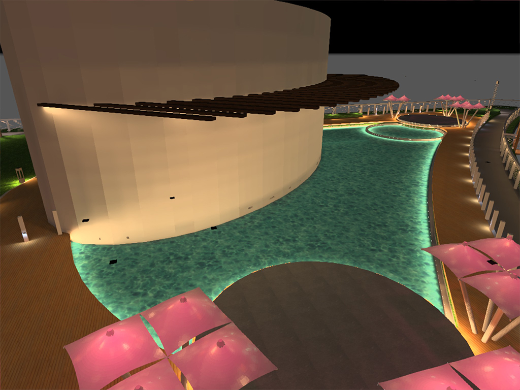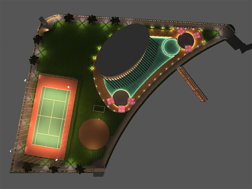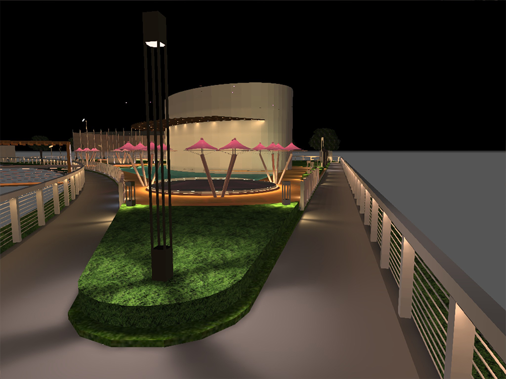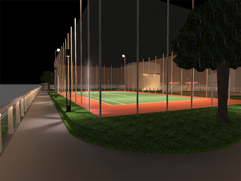 The landscape illuminations of this project is designed keeping in mind the goal of creating a warm and cosy nightscape. Keeping in mind the modern theme of the project and its multiple utility area and the multiple podium roof club house the lighting scheme is planned. The sports area, swimming pool, water body have compound lighting.The cantilever pool roof, the tensile structure, jogging track have LED lights and bollards giving it a floating effect.