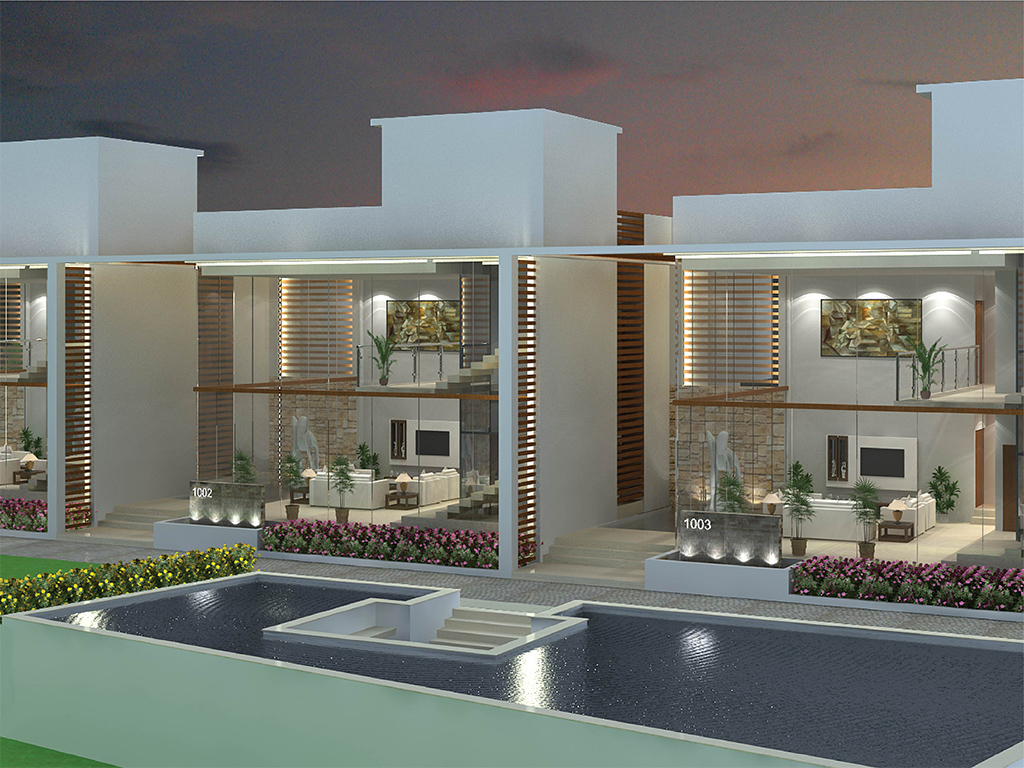 The client envisioned a comfortable living space for the residents and a visual treat for the onlookers. The idea therefore for the African Bungalows was to design them using a modular approach facilitating multiplication of units as and when required. The reflecting pool and sculptures set a calming tone to the structure. Glass is prominently used in the entire construction reflecting the exterior ambience creating a feeling of vastness. An individual basement parking space is provided for each unit which can be accessed from the bungalow itself. This effectively addresses the issue of vehicular parking and movement keeping the exteriors free from distractions.